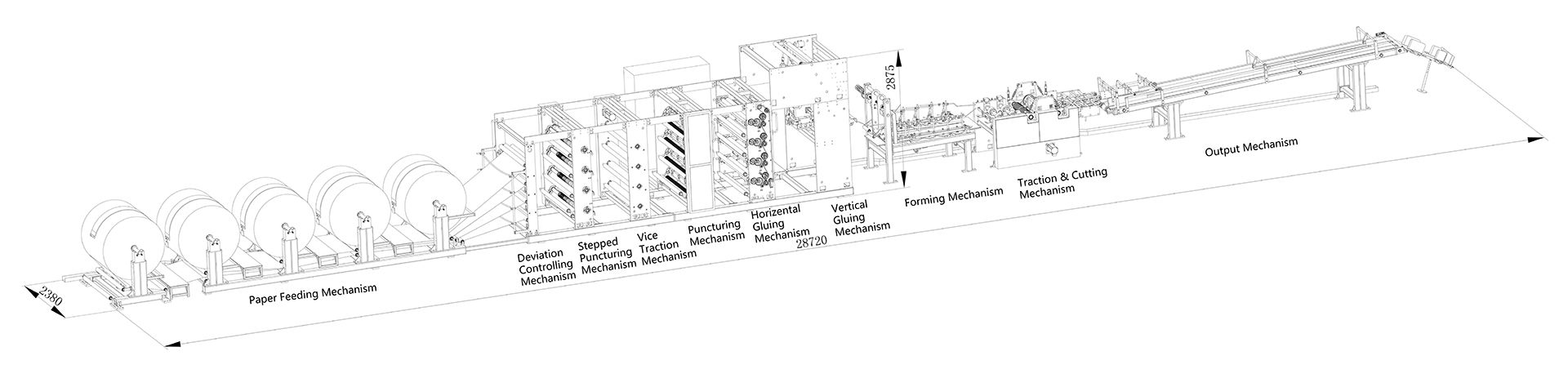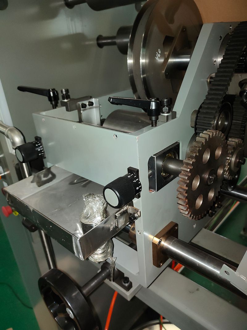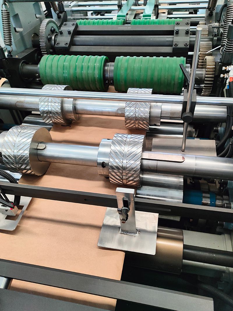 Equipada com rolos de pressão de corte dianteiro e traseiro, a elevação e abaixamento dos rolos é controlado por câmeras; os tubos de saco de papel são separados de uma a um na linha de perfuração em virtude da pressão descendente e da diferença de velocidade dos rolos de pressão de corte dianteiro e traseiro;