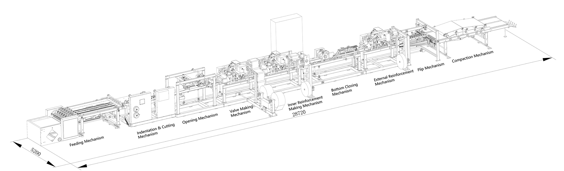 O mecanismo de fabricação de válvula cola papel valvulado nos sacos, formando uma válvula. Clientes podem ajustar os parâmetros na tela e determinar o comprimento do papel valvulado.